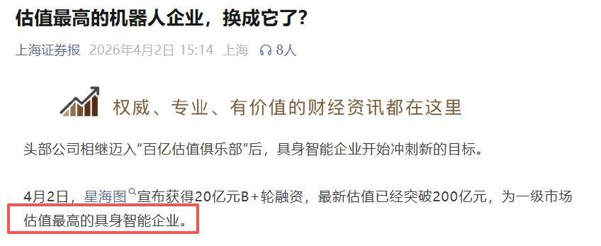 星海图刚刚宣布完成20亿元B+轮融资,最新估值飙升至200亿元。而就在不到两个月前的2月11日,它的身价还停留在百亿量级。