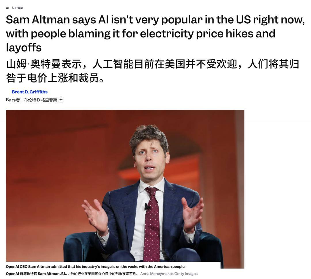 奥特曼也明白,AI在美国大众的心目中并不受欢迎,很多人认为电价上涨、大量裁员的罪魁祸首就是AI。