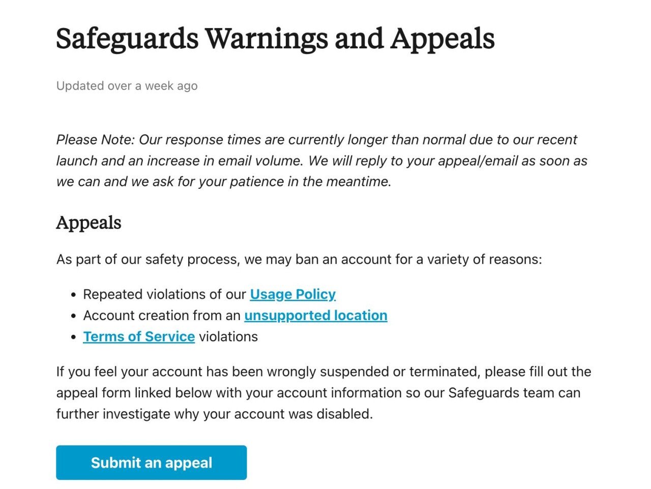 Claude 官方帮助中心目前的表述是,账号可能因为反复违反使用政策、来自不支持地区注册,或违反服务条款而被停用,若用户认为自己被误封,可以走 appeal 流程申诉。规则听起来很明确,但实际操作起来就没有这么简单了。按照官方的说辞,由于产品上线和邮件量增加,回复速度可能慢于平时,试想一下,假如你是一名开发者,账号莫名其妙被封禁了,申诉还要等上一两天时间,岂不是工作的计划全被打乱了?