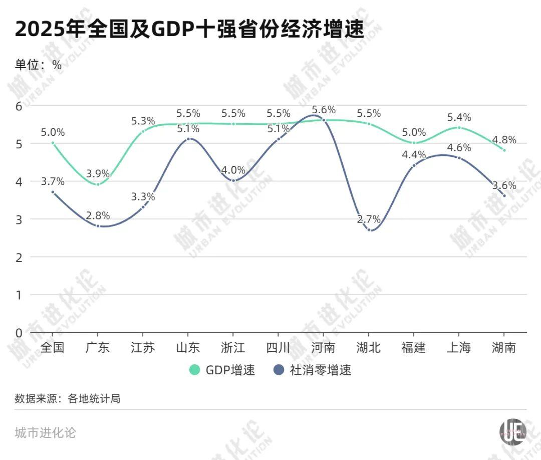 2025年,在苏超等活动加持下,江苏全年社会消费品零售总额达到46394.2亿元,首次超过广东,登顶全国消费第一省,消费对江苏经济增长的贡献率也提高到55%左右。