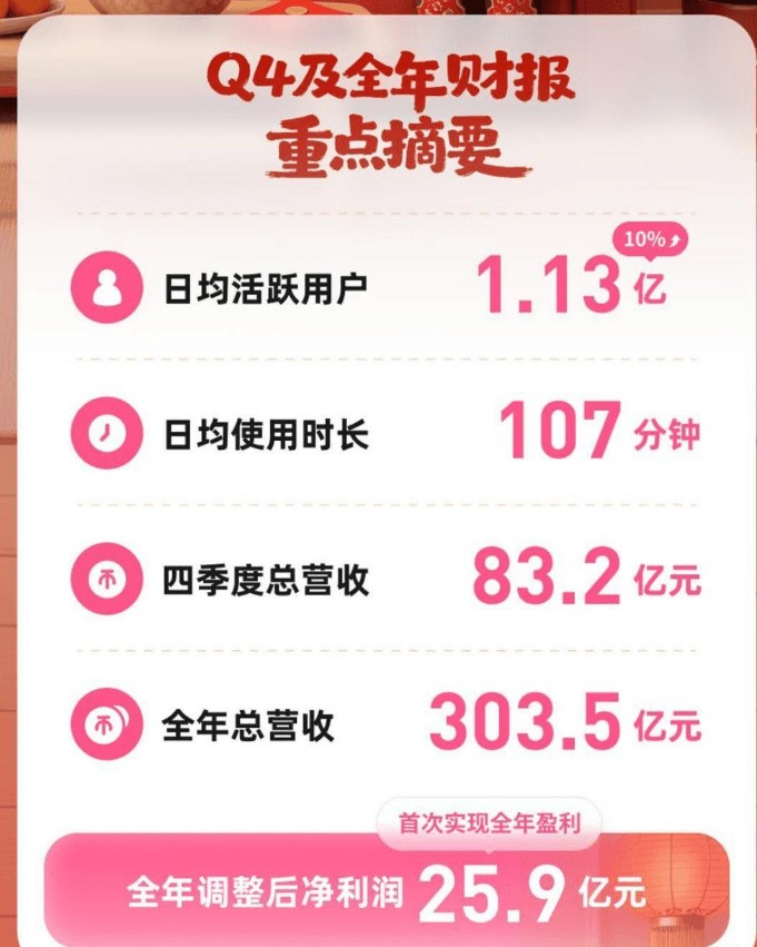 2025年,B站实现营收303.5亿元,同比增长13%;调整后净利润25.9亿元,是2018年上市以来的首次全年盈利。