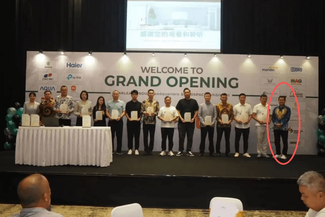当天,Starlead Group旗下Prospace展厅在印尼Alam Sutera Kino Tower正式开幕。现场照片清晰显示,刘立荣身穿印尼传统服饰,站在颁奖仪式的队伍中,中间嘉宾或合作方手持证书,他本人则站在右一,无疑是主办方之一。