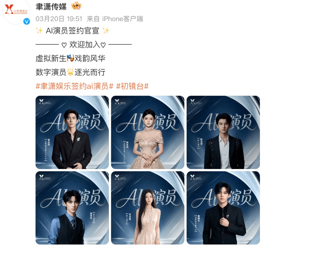 3月20日,聿潇传媒官宣签约六名AI演员,名单中既有新人演员,也包括千万粉丝级网红韩安冉和徐志滨。与过去AI换脸、AI合成带来的侵权争议不同,聿潇传媒明确表示“签约均为真人建模,绝对尊重肖像版权”,将AI演员的探索推向了合法合规的新阶段。