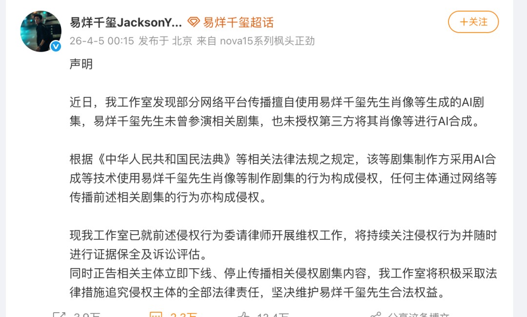 4月5日凌晨,易烊千玺工作室发布声明,称发现多个网络平台传播擅自使用其肖像等生成的AI剧集,其中《午夜公车:她捉诡超凶的!》热度值接近4000万,而另一部《骗我投个好胎?行,你们别后悔》热度值甚至逼近7500万。工作室措辞严厉:已委请律师开展维权工作,将追究侵权主体全部法律责任。