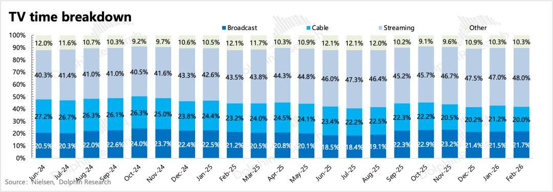 从北美Nielsen收视份额的数据来看,剪线趋势在走过“后疫情线下经济回归”导致的平台期后,近两年又有一些加速,截至2月流媒体收视份额提高到48%。