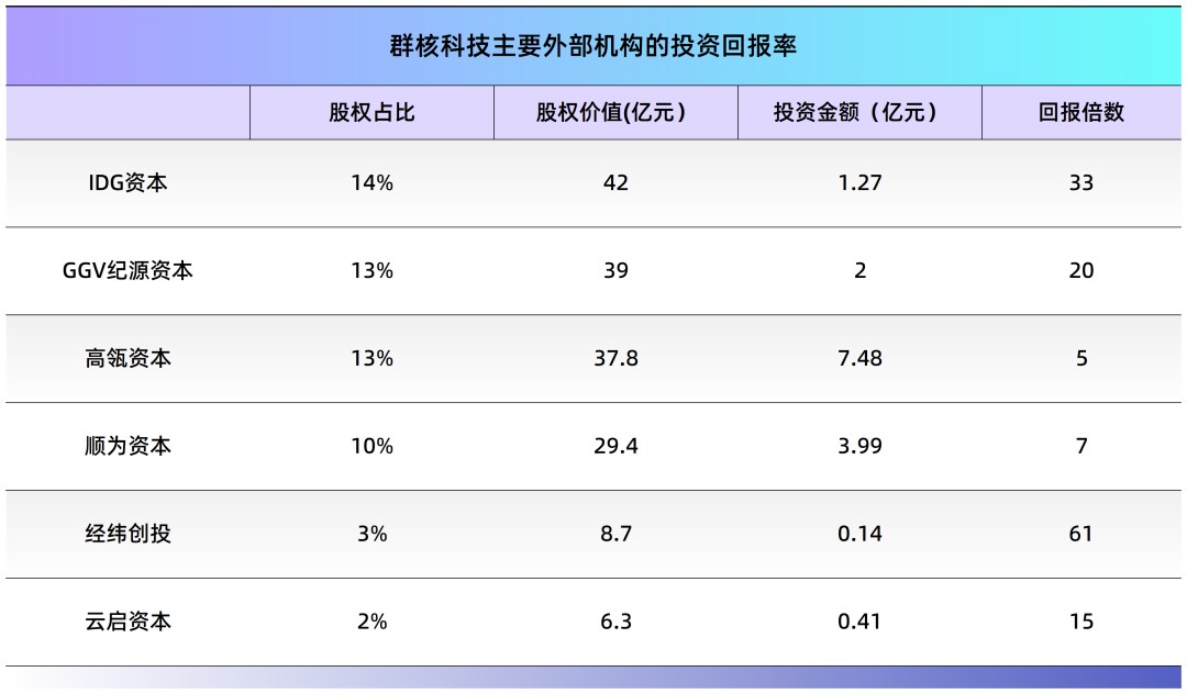 时间线上,IDG资本在2014年首次融资的A轮就已入场,成为它的首个投资方。此后又在多轮融资中持续加注,上市前为机构第一大股东。按表内口径,其目前持股约14%,以市值300亿元计算,对应股权价值约42亿元,累计投资约1.27亿元,账面回报约33倍。