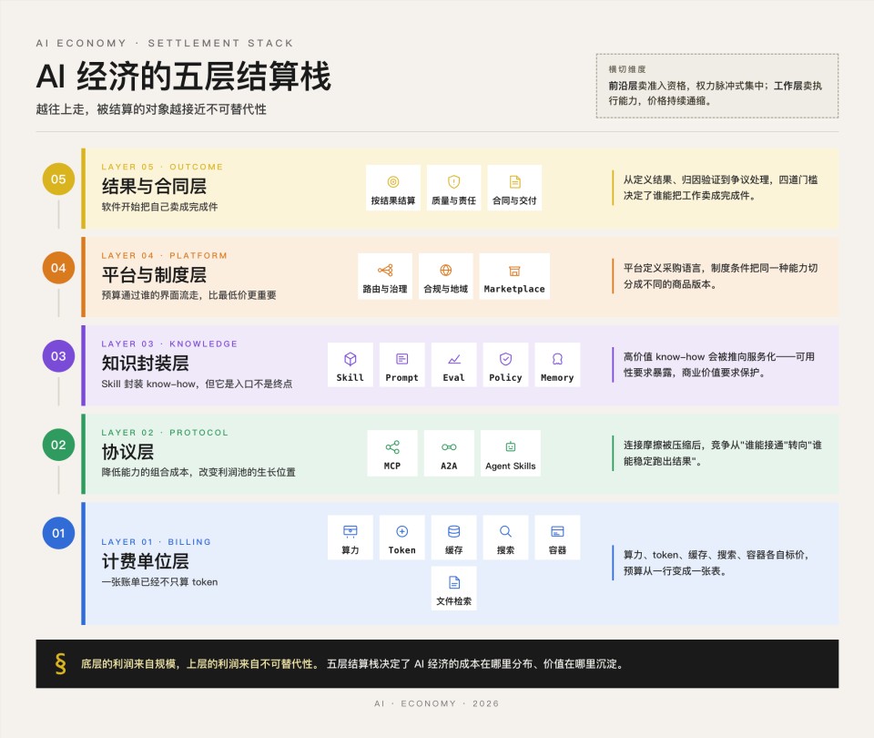 把视野再拉远一点,如果计费单位已经不只是token,那“钱到底会沉淀在哪一层”这件事,就得分层去看。