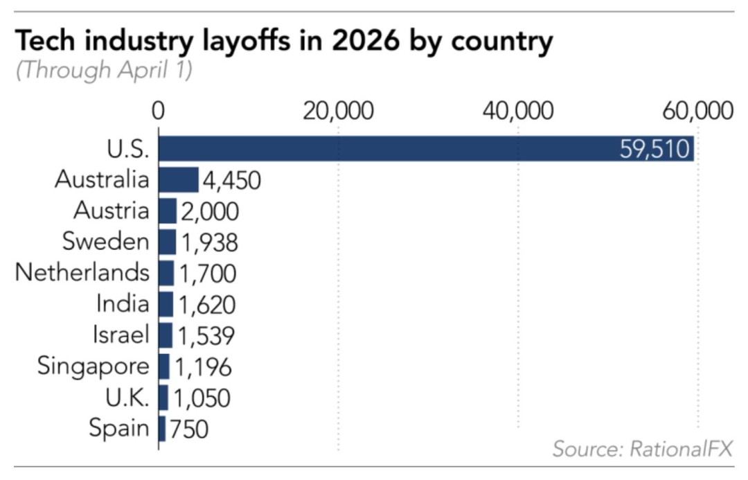 科技行业的大规模裁员正在世界各地蔓延。4月8日,《日经亚洲》发文称,今年第一季度,全球科技公司的裁员人数达8万人,其中近半数岗位削减直接或间接归因于 AI 技术的实施与工作流自动化。