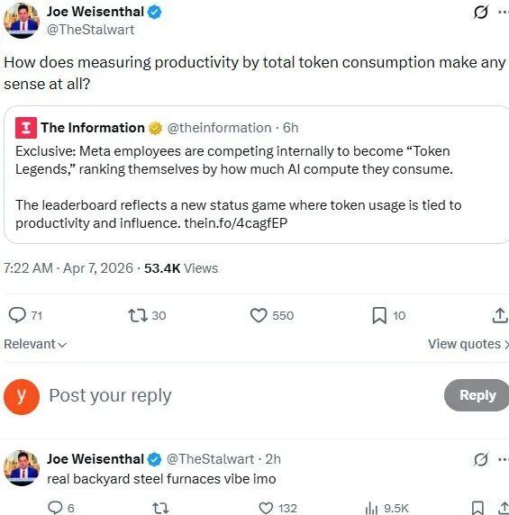 Meta内部已经有团队将Token消耗量作为AI渗透率的衡量标尺,部分员工为了“显得自己很懂AI”,会故意运行大量冗余的模型调用任务;国内腾讯等大厂也被爆料存在类似现象,一些业务线甚至发明了“Token刷量”的灰色操作。