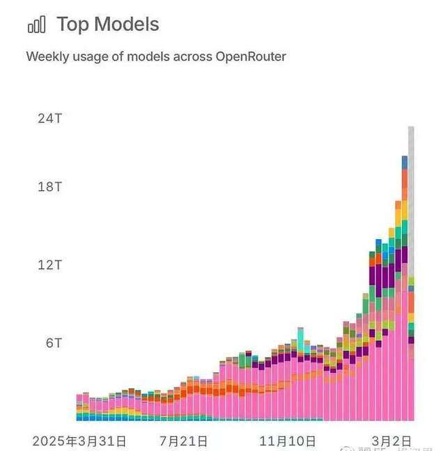 OpenRouter显示,2026年3月16日这周,Token调用周消耗数字为20.4T,是2025年同期的11倍