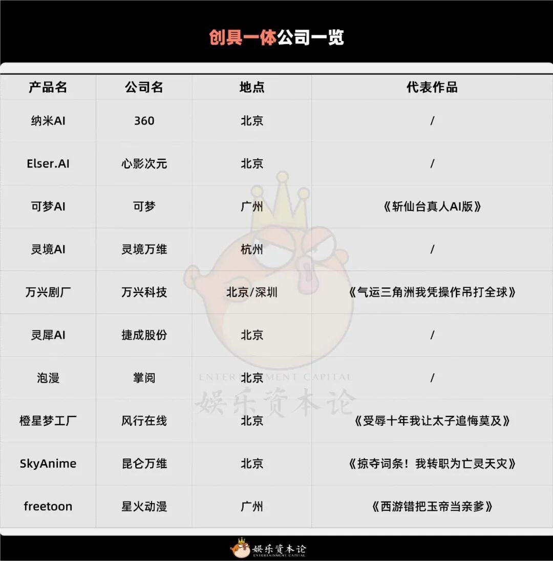 同时,这些具创一体公司的母公司,都具备一定的技术或内容基因。很多企业的母公司就是互联网大厂,创始人也多为互联网老兵。这使得他们可以从“卖铲子”和做内容两个身份之间无缝切换。