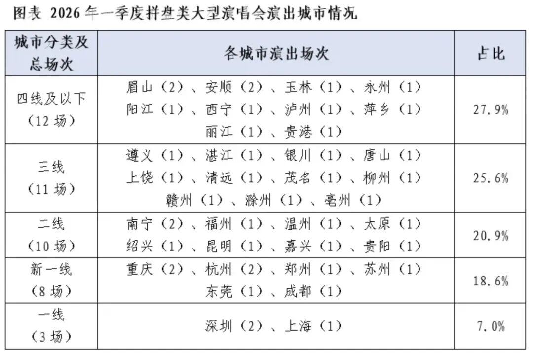 可以看到,Q1拼盘类演唱会资源持续向三四线及以下城市倾斜,其中四线及以下城市举办了12场,位居各线城市首位;三线城市也举办了多达11场,同比数量稳中有升。两者合计贡献超五成的拼盘演出,其对县域及周边区域文旅消费的拉动作用越来越不可小觑。