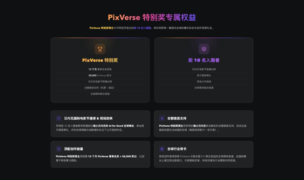 所有入围前 10 名的决赛选手将受邀前往瑞士日内瓦,参加AI for Good 全球峰会官方颁奖典礼。获奖作品将在来自150多个国家的政府代表、国际组织与行业领袖面前展映。与此同时,获奖创作者还将获得 PixVerse 与 ITU 的联合媒体报道,并有机会与国际政策制定者和行业专家交流。优秀创作者将优先获得加入PixVerse 创作者合作伙伴计划(CPP)的资格。投稿通道:https://pai.video/challenge/brand/398814299576192