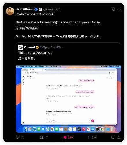 奥特曼照例故作神秘,发了一条推文:“我们准备了一些有趣的东西。”