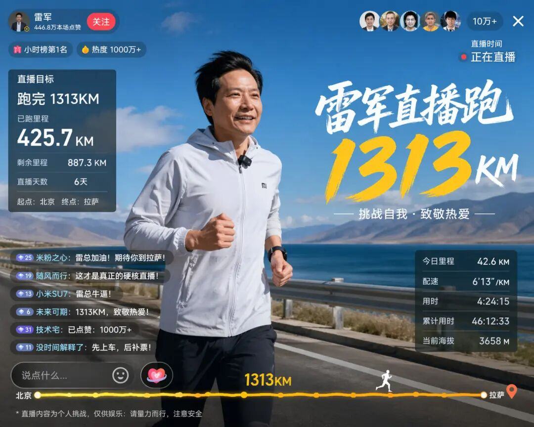 这张图让不少开发者倒吸一口凉气。雷总面部特征精准还原——简直像照片——图中还赫然显示着:直播目标1313km、已跑里程425.7km、剩余里程887.3km。更绝的是,当前海拔标着3658m。