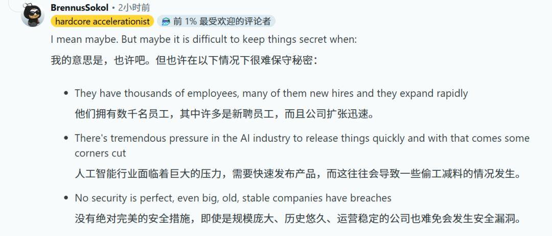 一派认为这是纯粹的工程事故。理由是:OpenAI几千名员工,扩张速度极快,AI行业的发布节奏又催得紧,安全漏洞几乎是必然的。