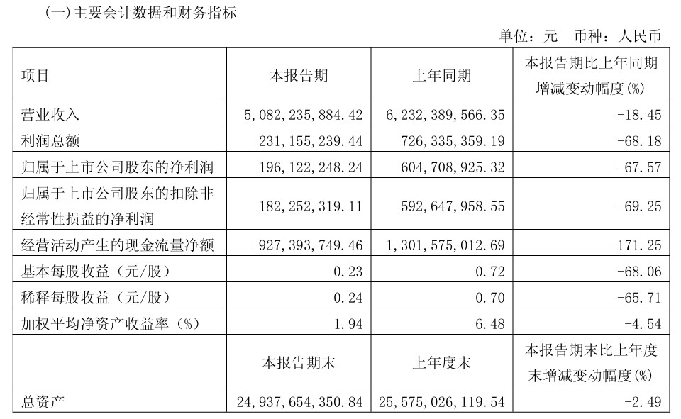 数据显示,2026年第一季度公司营业总收入为50.82亿元,同比下滑18.45%;而归母净利润仅有1.96亿元,同比暴跌67.57%;扣非净利润1.82亿元,同比下降69.25%。