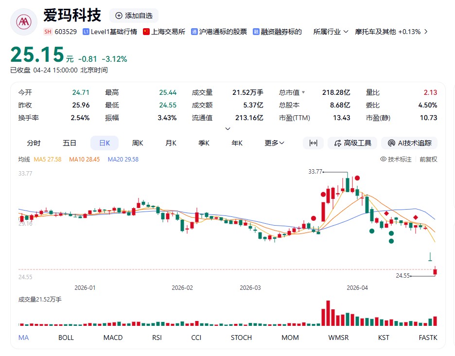 随后4月23日,爱玛科技开盘跌停,报25.96元/股,市值225.31亿元,股价砸出20个月来的新低。4月24日,爱玛科技股价再度走低,收于25.15元/股,市值再度缩水。