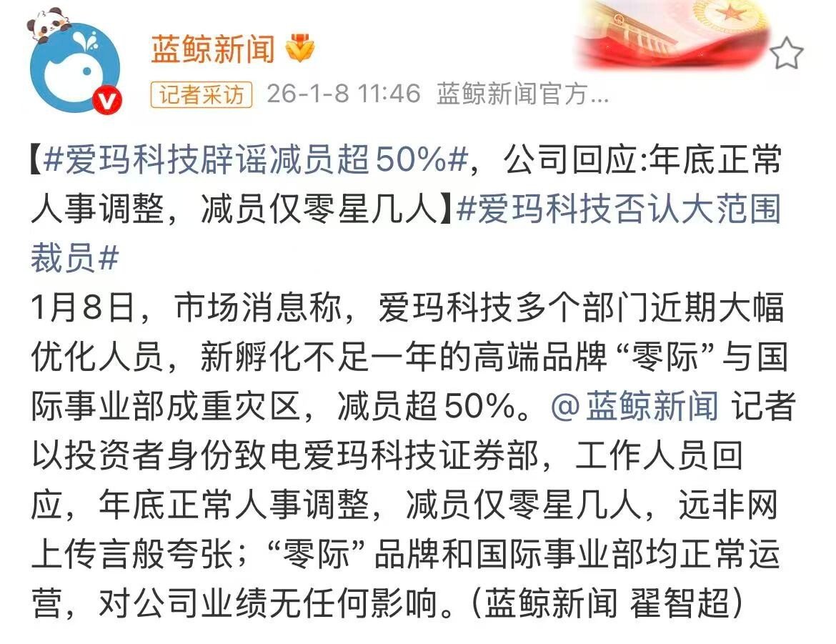 1月8日,蓝鲸财经记者以投资者身份致电爱玛科技证券部,工作人员回应,年底正常人事调整,减员仅零星几人,远非网上传言般夸张;“零际”品牌和国际事业部均正常运营,对公司业绩无任何影响。爱玛集团某海外区域市场的负责人对外表示:“海外事业部裁员50%是炒作,根本没有这样的情况。”