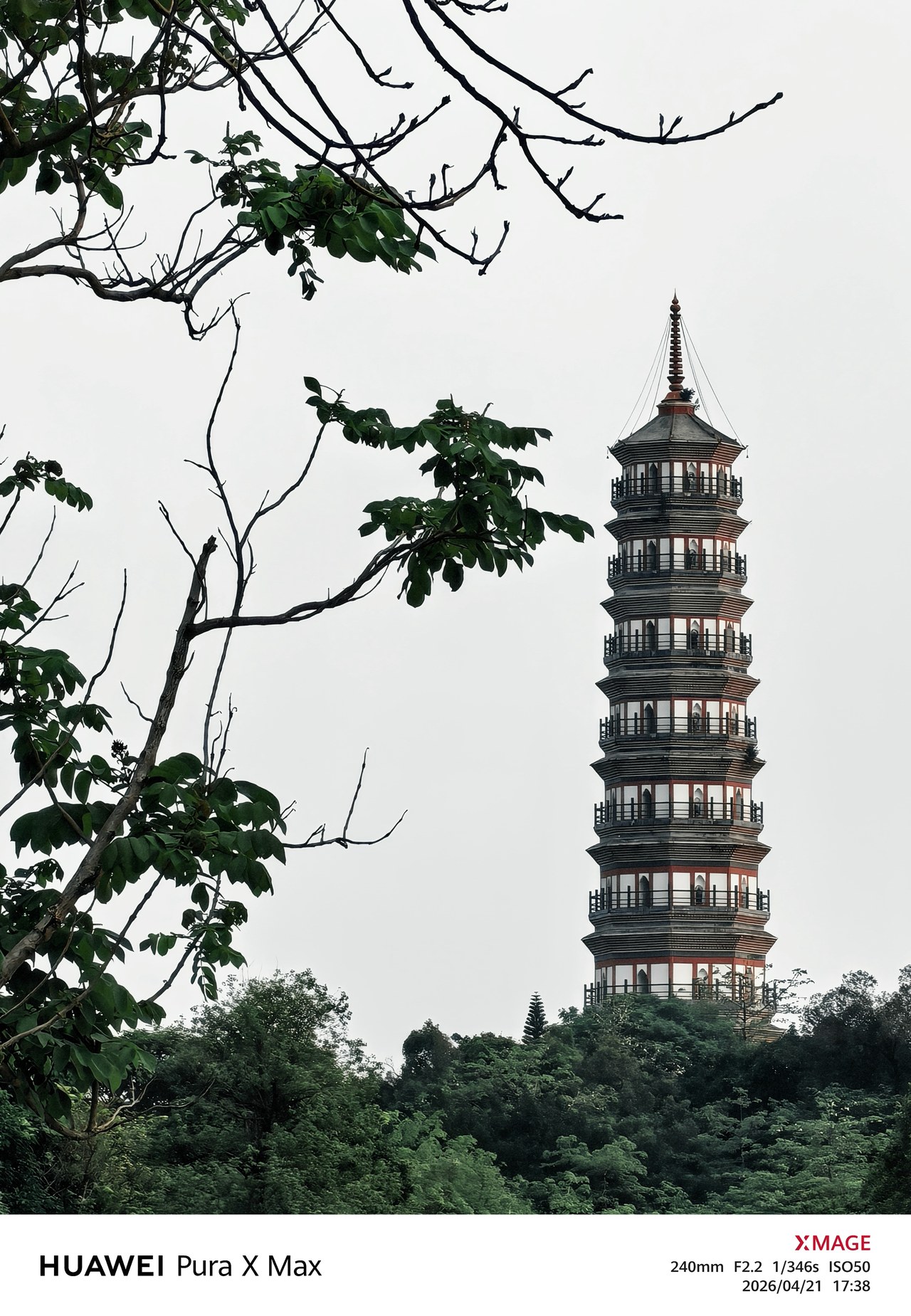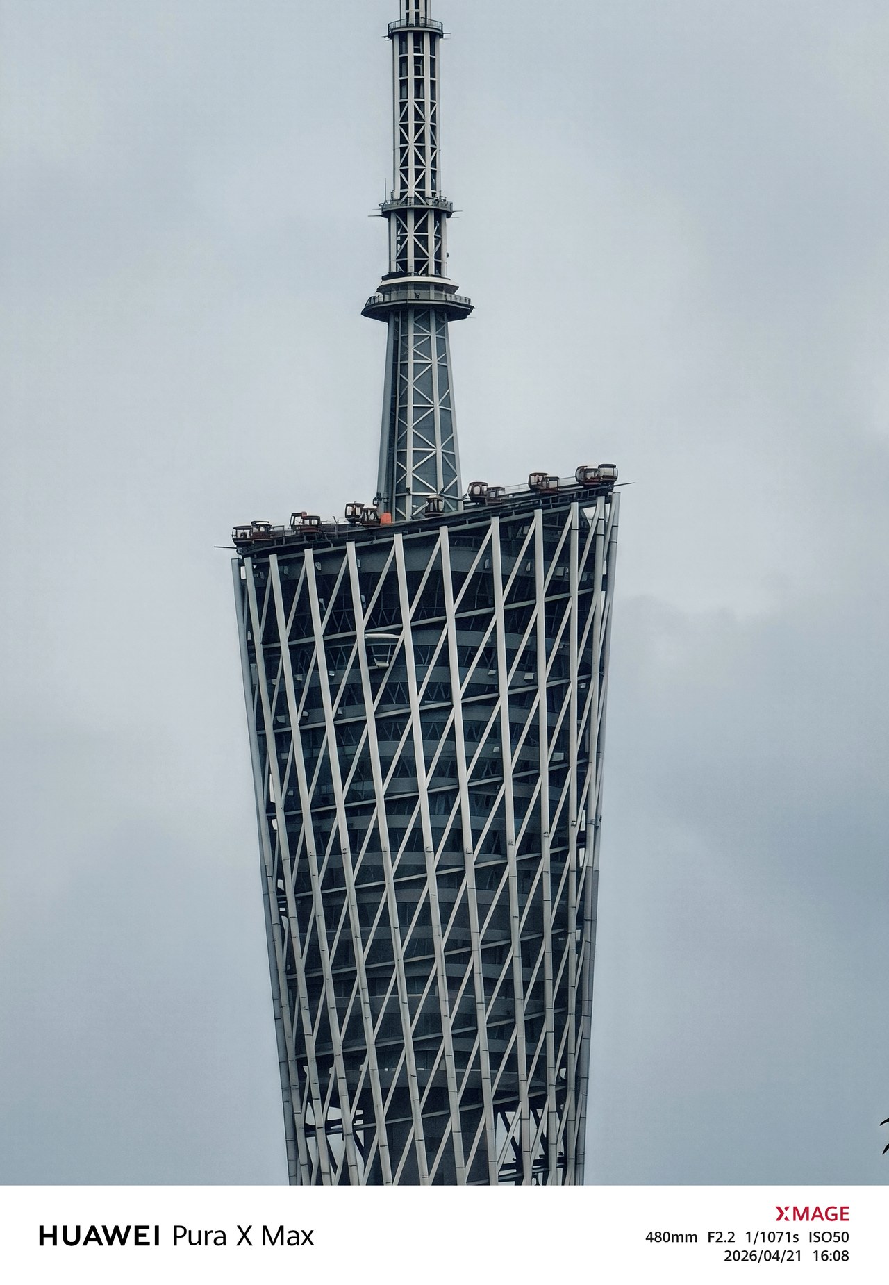 而在超长焦方面,Pura X Max 的计算摄影能力也能更尽可能多地捕获远处的细节,用来拍建筑非常合适。比如这张广州塔(等效 480mm、20×长焦)的照片,建筑就非常干净,没有过去 AI 长焦常见的「AI 纹路」,看起来很自然。