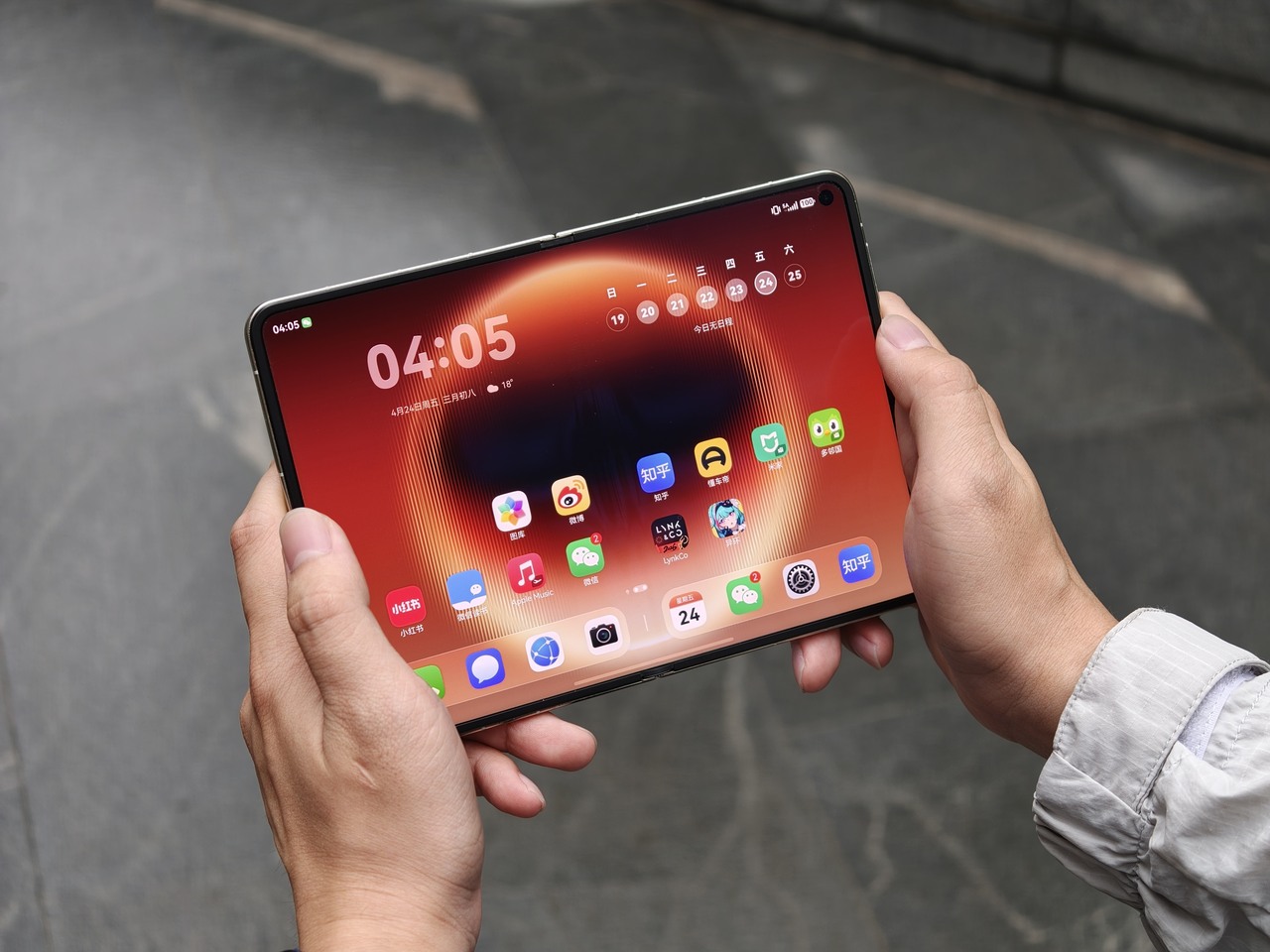至于 Pura X Max 的外屏,我们就需要分开讨论了。平心而论,85mm 的机身宽度远比一般的手机要宽,几乎和护照本(88mm)等宽了。对于小雷这种大手掌用户来说,Pura X Max 的宽度无论单双手使用都很合适:单手使用时拇指能够到手机的核心操作区,双手打字时两个拇指也不至于碰到一起。