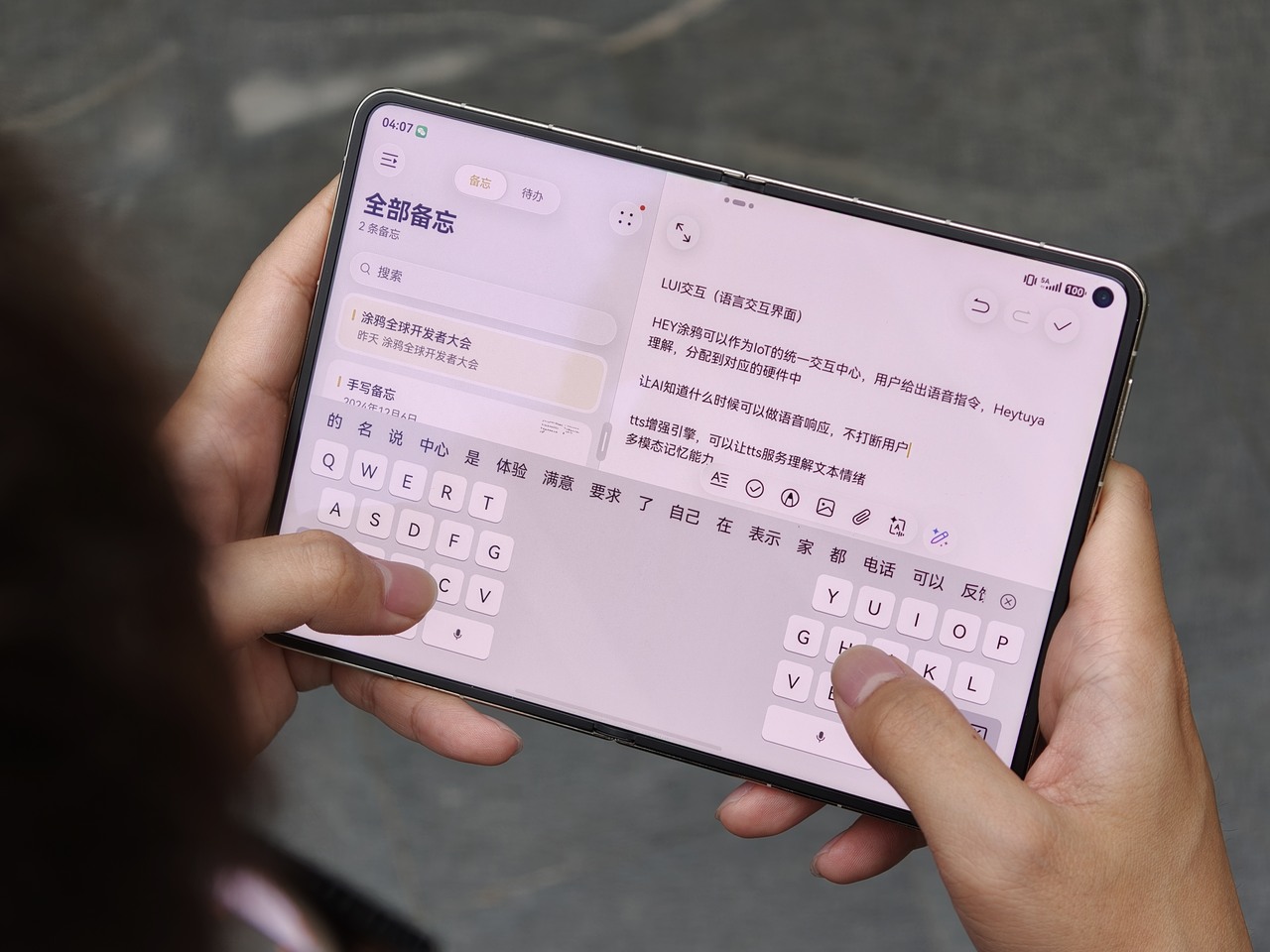 16.6×12cm 的机身尺寸属于小屏平板的手感「甜区」——小雷这样手大的用户单手可以正常使用,双手横屏使用时也不会觉得局促。但即使是小手用户,Pura X Max 的内屏也不至于拿不住,搭配 HarmonyOS 6.1 的拇指键盘(分离全键盘),输入效率确实挺高。