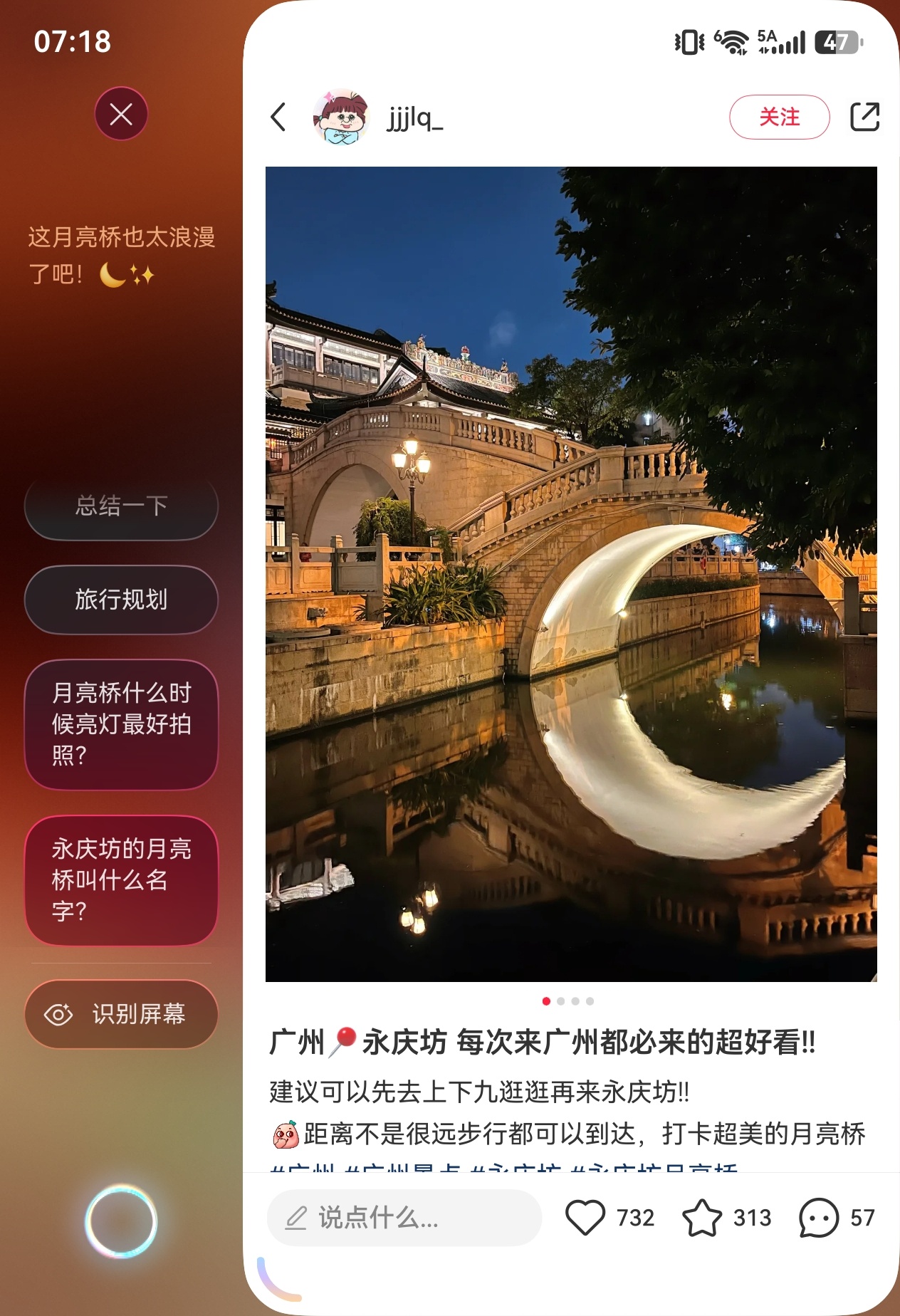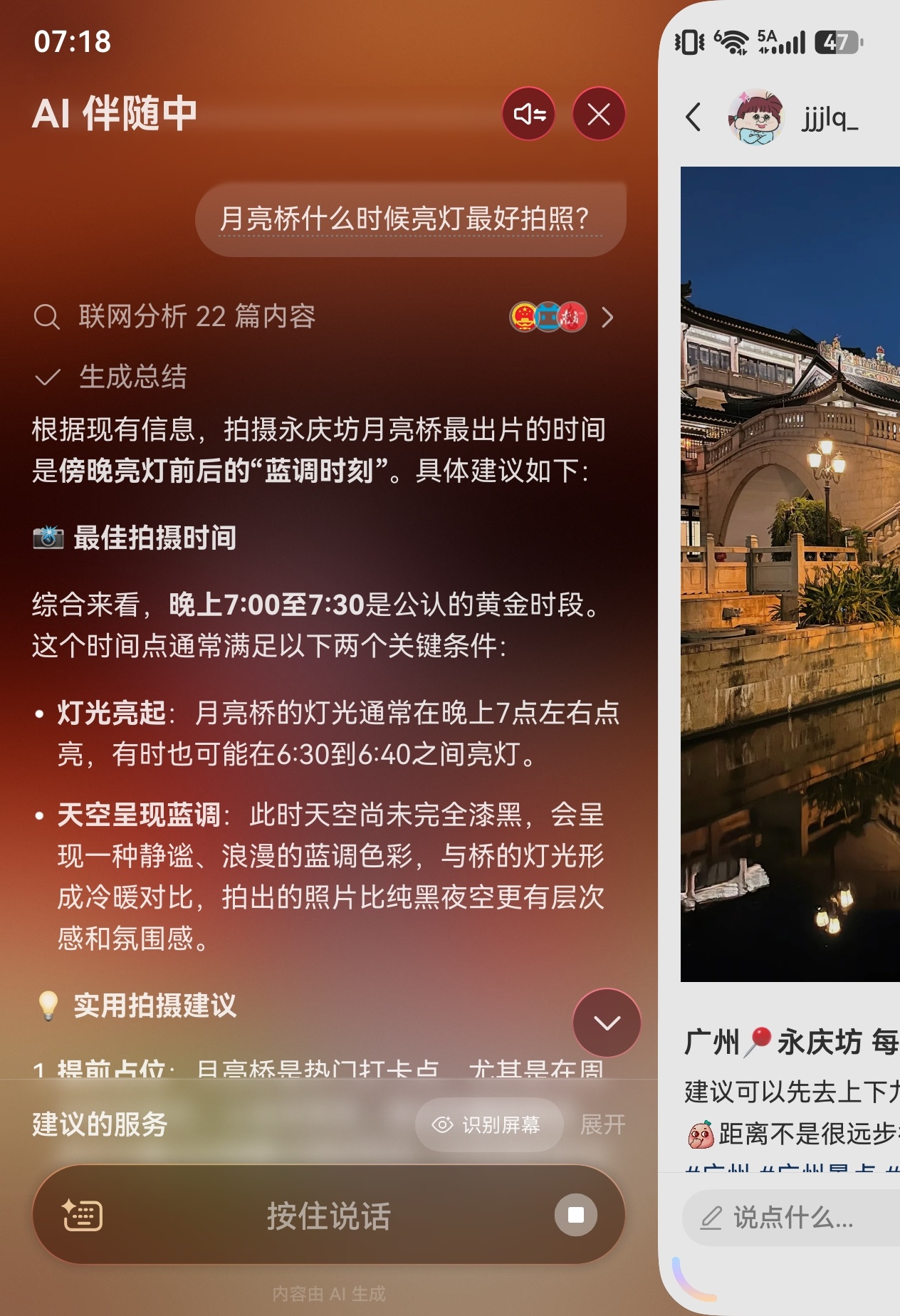 比如用 Pura X Max 看小红书时,雷科技就发现了一个不错的拍照点位。双击屏幕下方的导航栏,小艺伴随式 AI 就会找到对应的拍摄地点、建议的拍摄时间和构图。也可直接收藏起来,方便下次「抄作业」。