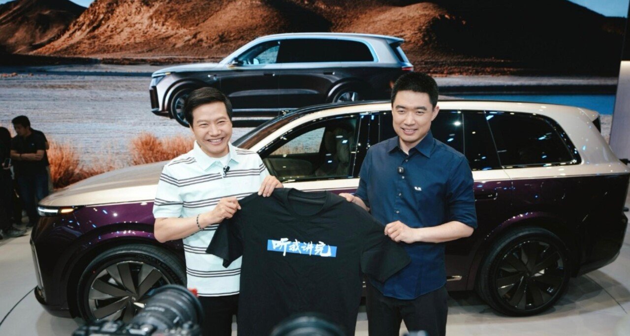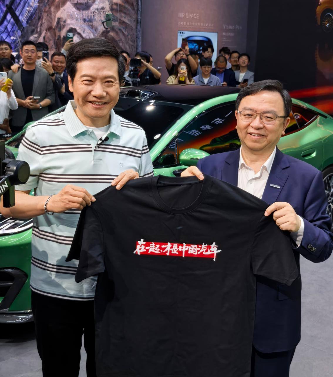 北京是小米汽车的主场,小米汽车自然不会缺席,其CEO雷军亲赴现场,与“蔚小理”的创始人李斌、何小鹏、李想,以及比亚迪董事长王传福互动。雷军赠送李想一件印有“听我讲完”的T恤。