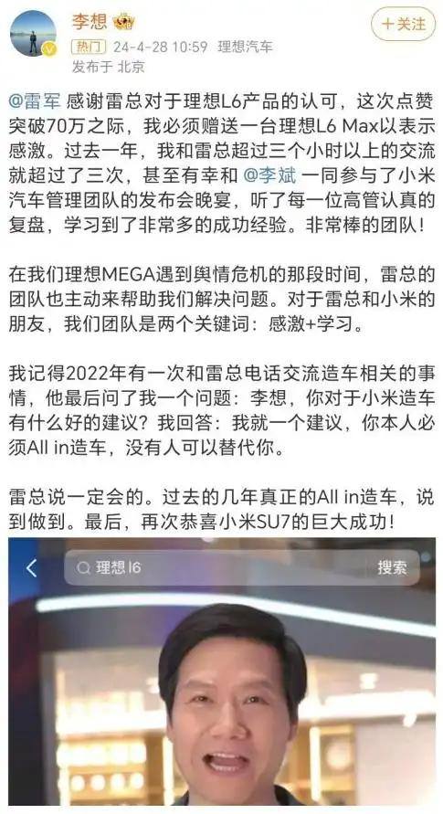 在互相学习之外,电车通(ID:dianchetong233)相信,雷军频繁与友商高管互动,还有一个原因是雷军希望通过自己的人气,让更多人关注汽车行业,关注中国汽车产业。