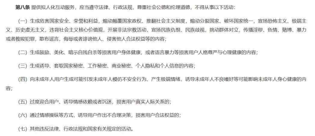 4月10日,国家网信办联合五部门发布了《人工智能拟人化互动服务管理暂行办法》,从内容生成、信息安全、未成年人与老年人保护等多个角度对AI情感陪伴做出规范。新规将于7月15日施行,人机恋圈子已经开始了新一轮焦虑。