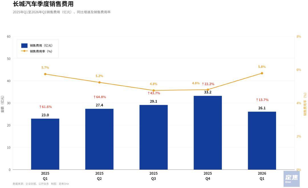 2026年一季度,长城销售费用率已升到5.8%。当同行的费用率走势已经相对稳定,长城依然是头部阵营里少数销售费用持续大幅上涨的车企之一。