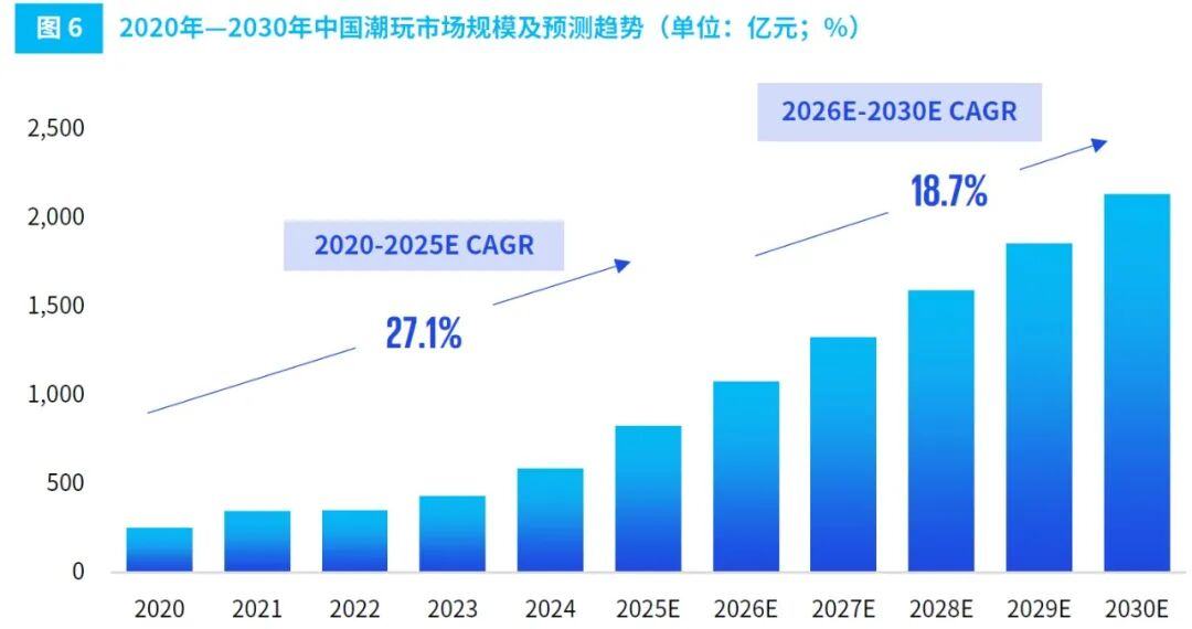 从全球来看,潮玩正持续从小众圈层走向大众市场。据国际知名会计师事务所毕马威2026年4月发布的调研报告《潮玩行业全景洞察与趋势展望》,2024年全球潮玩市场规模已达418亿美元,约合人民币2857.57亿元,同比增长14.2%,预计2025年将达520亿美元,约合人民币3554.88亿元;中国潮玩市场规模增速更快,2024年中国潮玩市场规模已达587亿元,预计2025年将达825亿元,2020-2025年CAGR(年均复合增长率)为27.1%,高于全球平均水平,预计2026-2030年CAGR为18.7%。