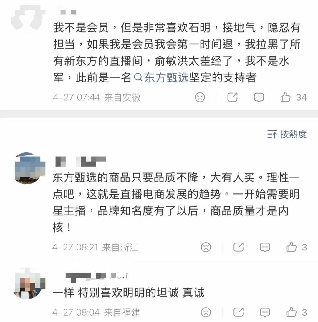 消息发酵后的数小时内,大量用户在社交平台发文宣布申请退出东方甄选付费会员,“退会员”、“掉粉”一时间成为评论区的高频词。