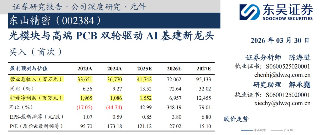 东吴证券《东山精密光模块与高端PCB双轮驱动AI基建新龙头》,2026年3月30日