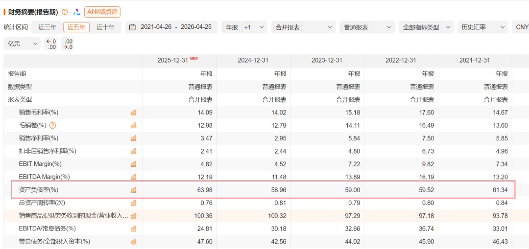 如果说商誉为未来业绩埋下隐忧,那么负债压力就已经摆在眼前。截至2025年末,东山精密的资产负债率高达64%,相隔数年后再度重回60%以上。公司账面货币资金约76.5亿元,但同时短期借款、一年内到期的非流动负债分别达到80.11亿元、34.88亿元。