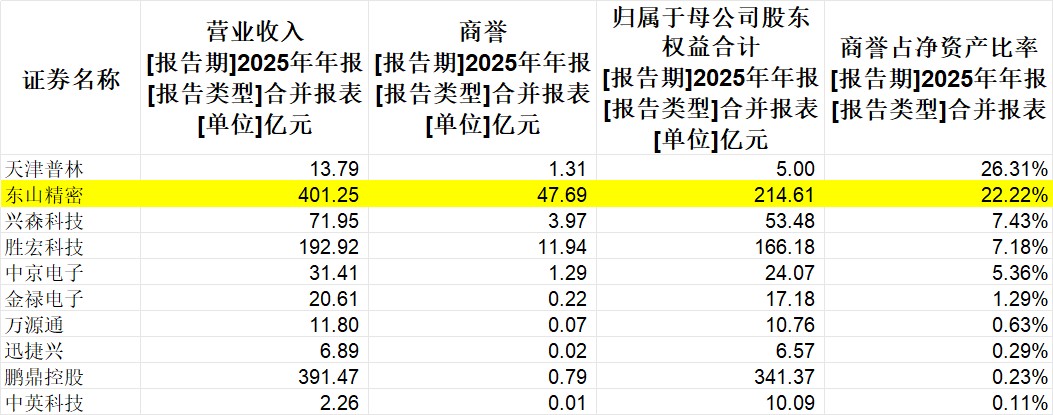 截至2025年末,东山精密商誉达到47.69亿元,同比增长125%。在申万三级行业印制电路板已经发布了去年年报的上市公司中遥遥领先,排名第二的是胜宏科技,商誉只有11.9亿元;此外,东山精密的商誉占净资产的比率为22.22%,也位于板块高位。