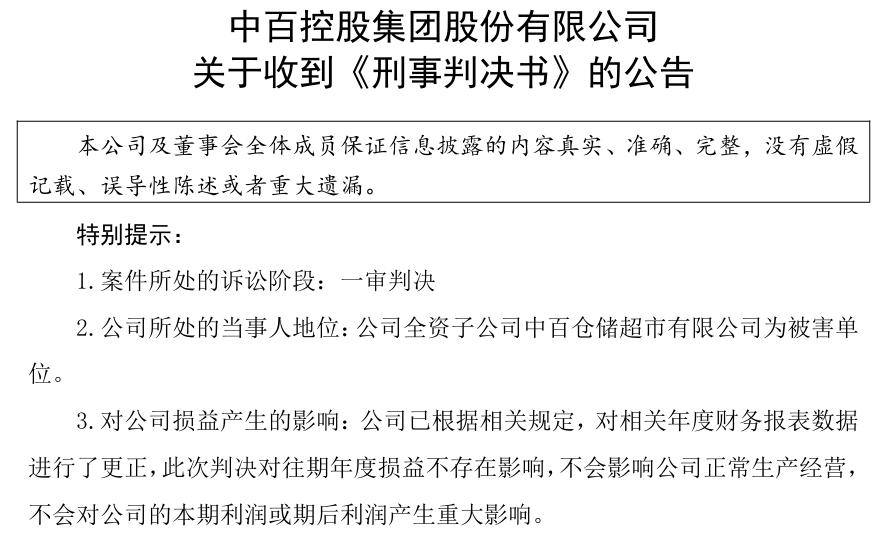 雪上加霜的是,今年1月,中百集团一则刑事判决公告,暴露了公司内控管理的漏洞,甚至影响了公司的财务状况及公信力。