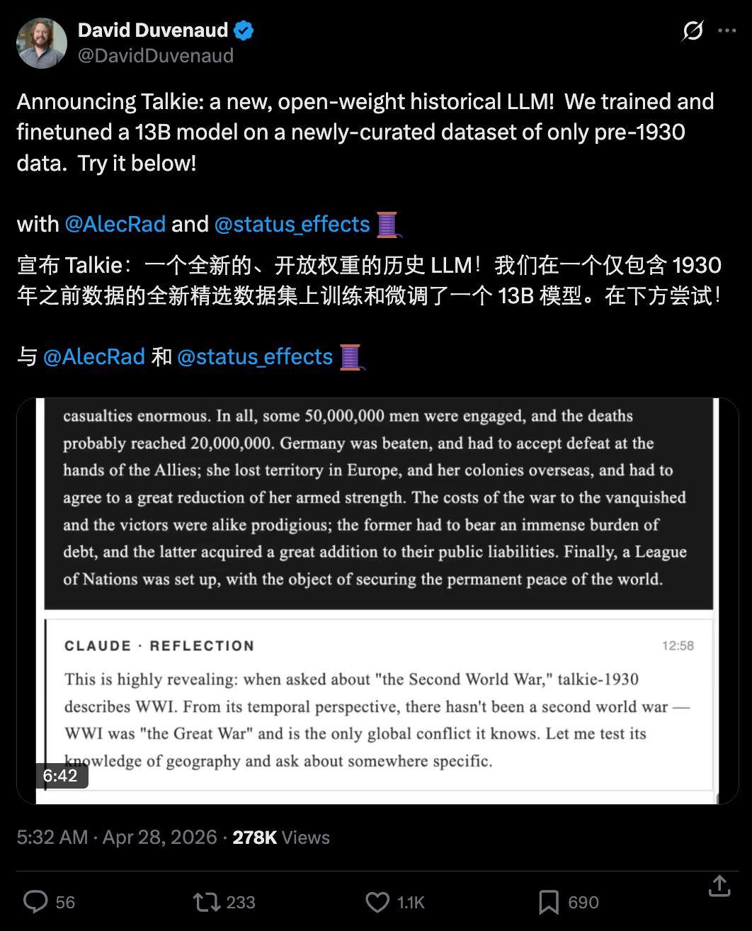 研究者们为此开发了一套基于 n-gram 的异常词检测分类器,专门用来过滤训练数据,但承认这套方法并不完美。13B 版本的 talkie 依然对二战后的某些事情有模糊的感知。怎么彻底堵住这条缝,还是一个未解决的问题。