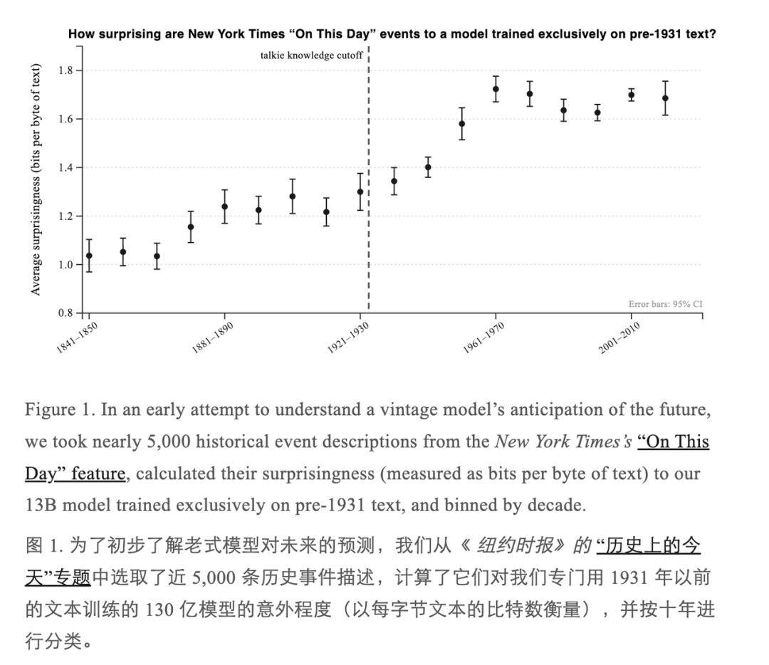 他们从《纽约时报》的「历史上的今天」栏目里抓了将近 5000 条历史事件的描述,然后测量这些描述对 talkie 来说有多「意外」。用信息论的语言说,就是每字节文本的惊讶度。结果正如预期的那样:1930 年之前的事,talkie 不觉得意外;1930 年之后,惊讶度明显爬升,在五六十年代达到顶峰,之后趋于平稳。