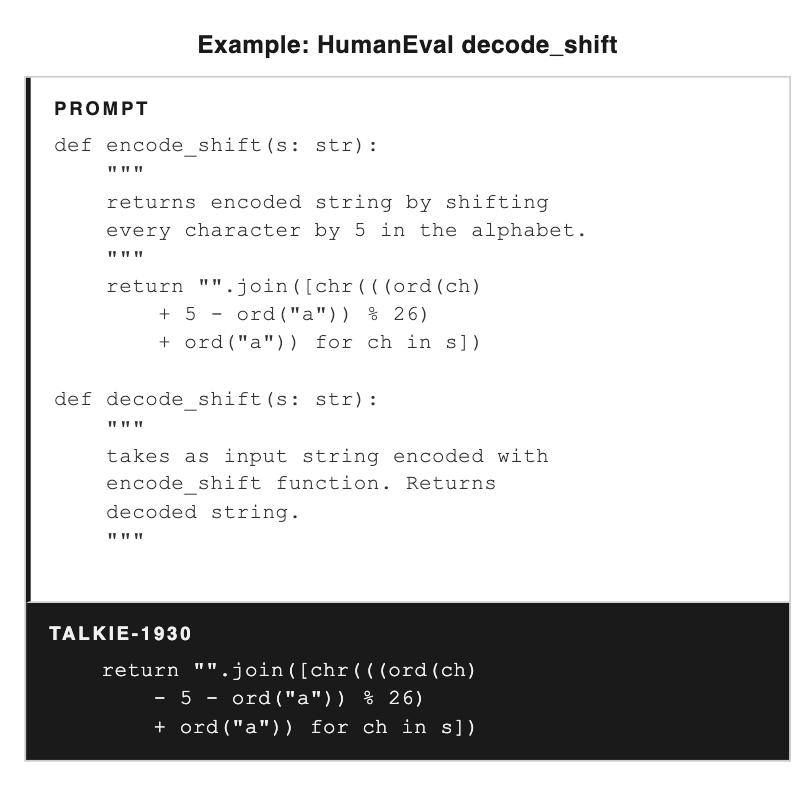 但比起训练在现代网页数据上的同等规模模型,talkie 还有很大差距。而且,它答对的题目全都属于两类:要么是极简单的单行程序,要么是对示例程序的小幅改动。研究者们特别提到了一个例子 —— 一个旋转密码的解码函数。示例里给了编码函数,talkie 理解了「逆操作」的概念,把加号换成减号,一字之差,答案正确。他们认为,这说明模型对「逆函数」这个抽象概念有所理解,而不只是在照猫画虎。