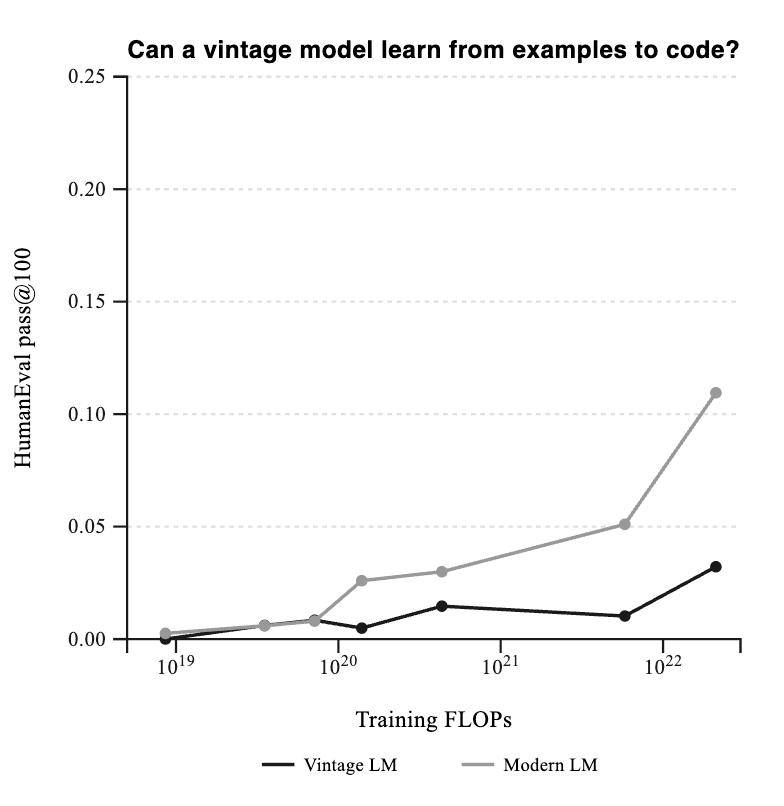 talkie 天然绕开了这个问题。它完全不知道 Python 是什么,也从未见过任何一行现代代码。于是研究者们做了一个实验 —— 用 HumanEval 这套标准编程测试来评估它。他们给 talkie 随机挑选几个 Python 函数作为示例,然后让它自己写一个新的出来,看它能在 100 次尝试中至少答对一次的比例有多高。