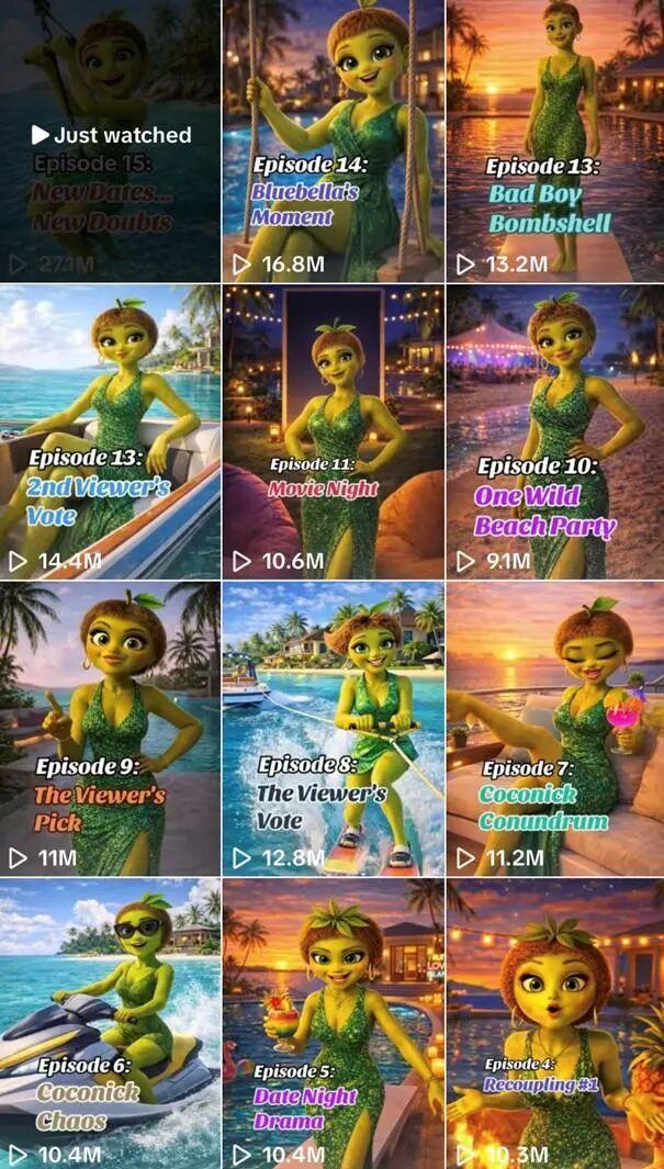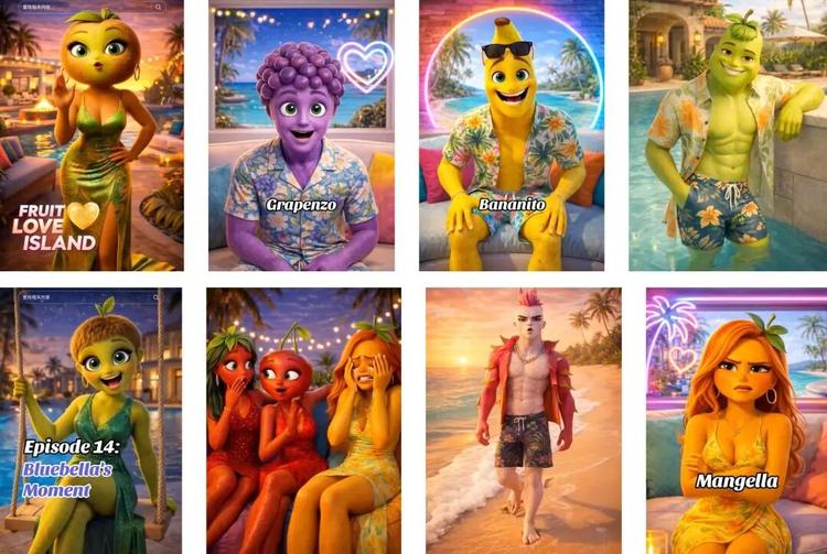 从传播路径来看,《水果爱情岛》几乎具备AI爆款的所有典型特征。视觉风格强烈、剧情冲突密集、更新频率极高、传播速度极快……低成本与高产出,使其在短时间内迅速占据注意力。