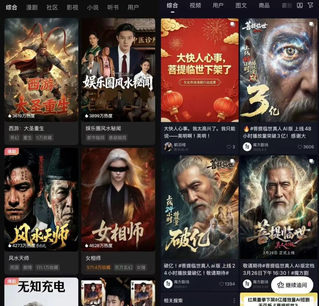 3月31日上线的《菩提临世真人AI版》,在清明假期期间迅速跃升为红果平台最具话题度的AI短剧。上线首日追剧人数达到181万,热度值8923万,48小时播放量突破3亿,迅速登上平台热播榜第一位。这部作品也成为了首部冲至红果热度TOP1的AI短剧,具有明显的阶段性意义。