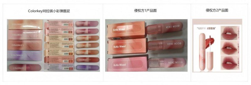 经调查,MKING PRETTY品牌和Kekemood品牌恶意抄袭珂拉琪小彩弹唇泥产品,“MKING PRETTY 丝绒柔雾唇釉”、“Kekemood小彩弹唇泥”与COLORKEY 珂拉琪小彩弹唇泥的包装装潢视觉效果基本相同,整体的装潢元素、商标标注方式、颜色选择等方面均构成高度近似。